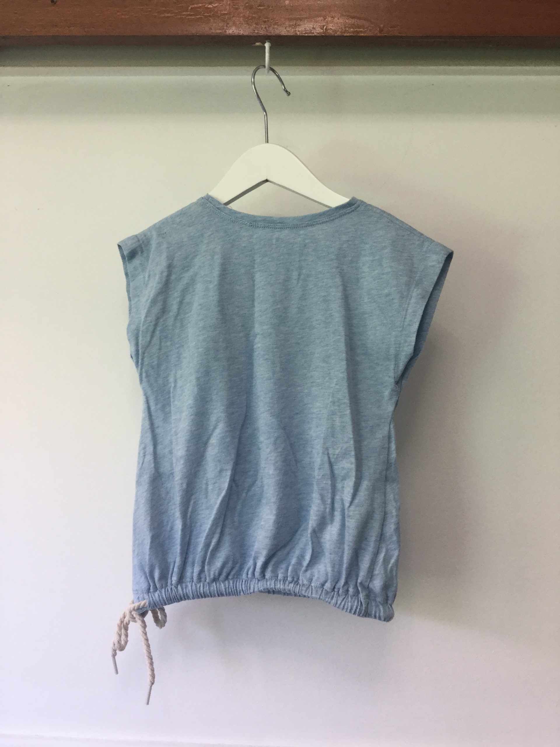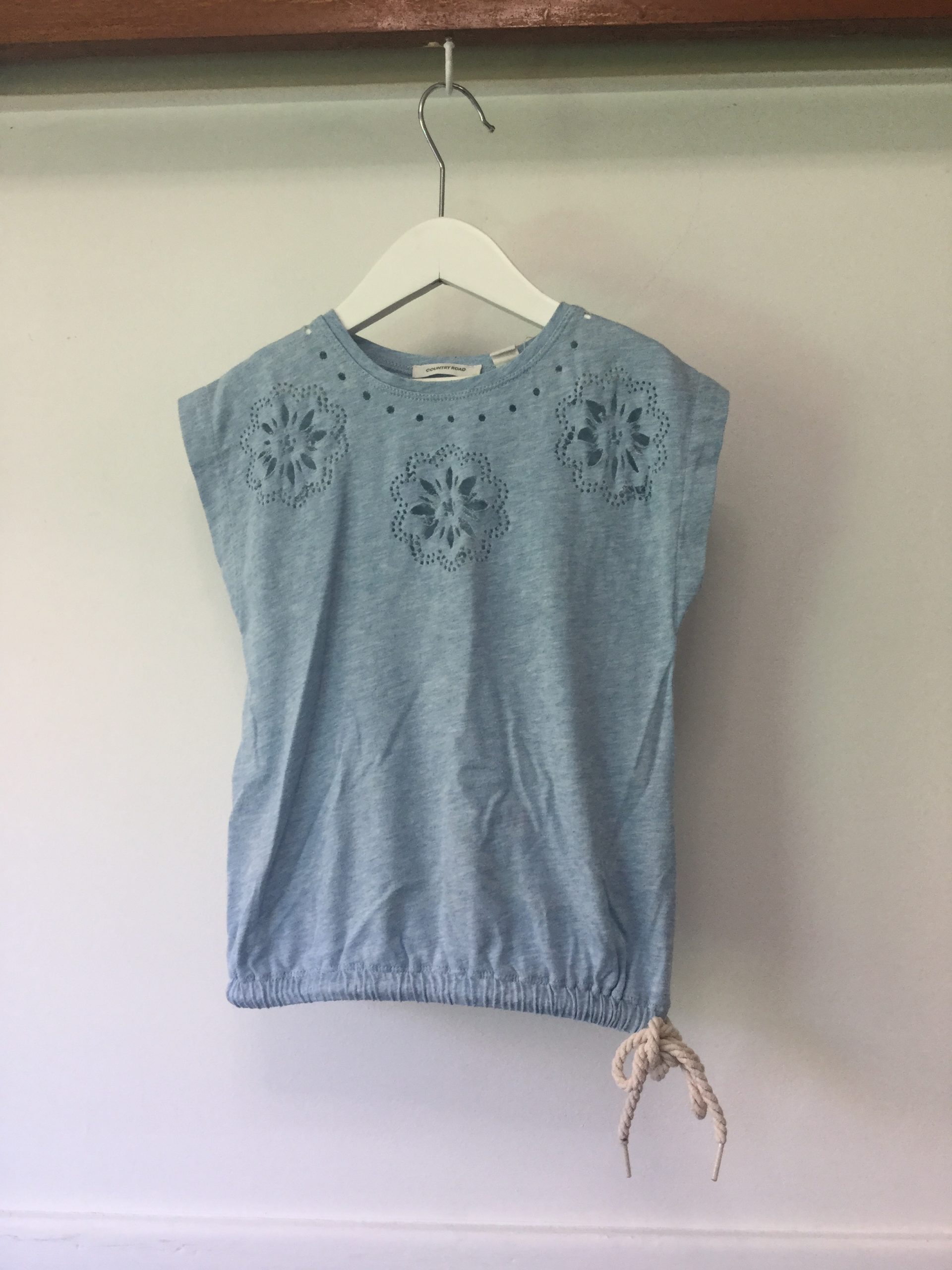 Country road pale blue, sleeveless top with cutaway flowers on the front and rope drawstring detail near the waist. Some of the cutaway holes are fraying and there are some very faint marks. This is a generous size 2 and would probably fit up to a four year old.
