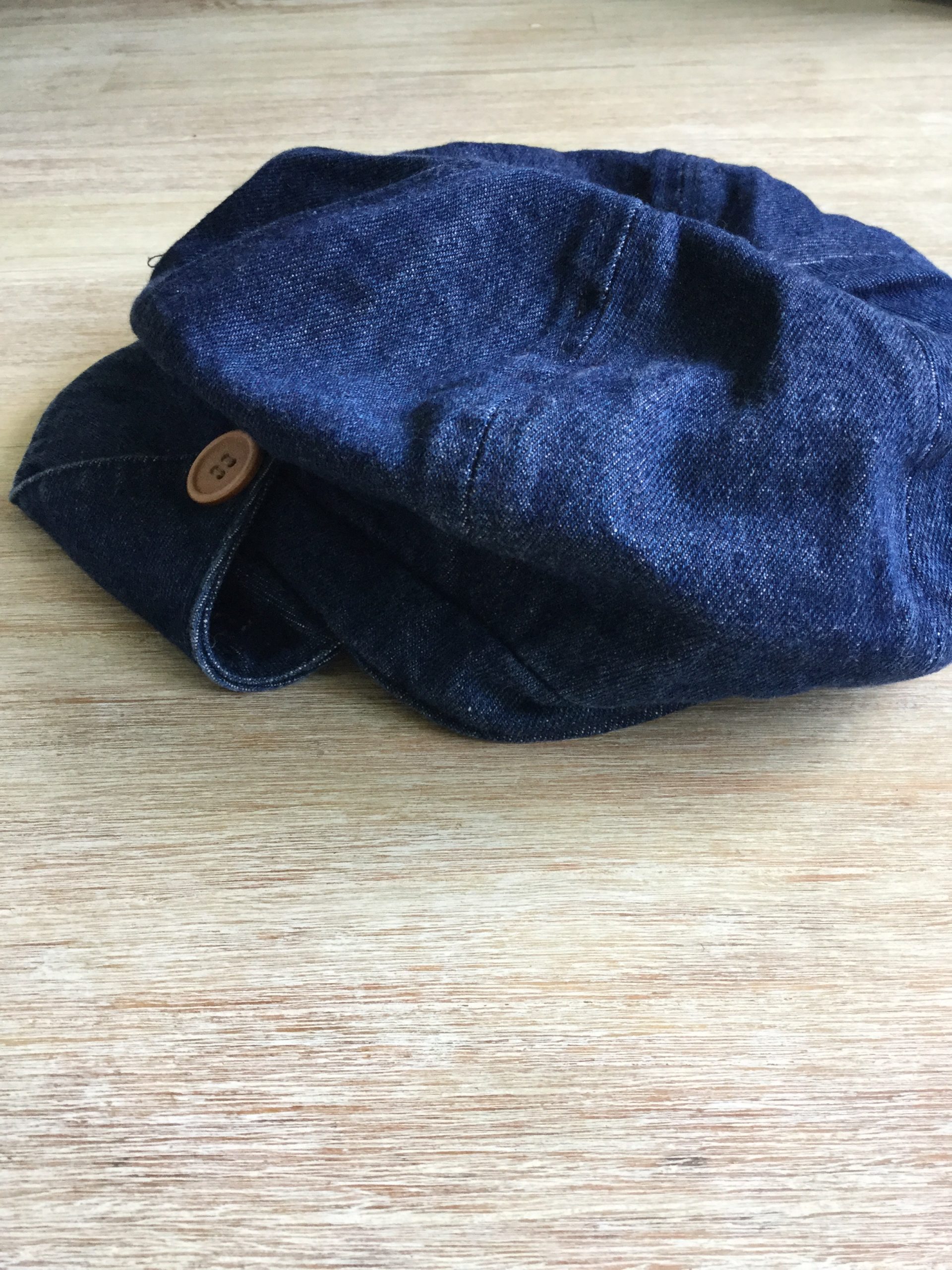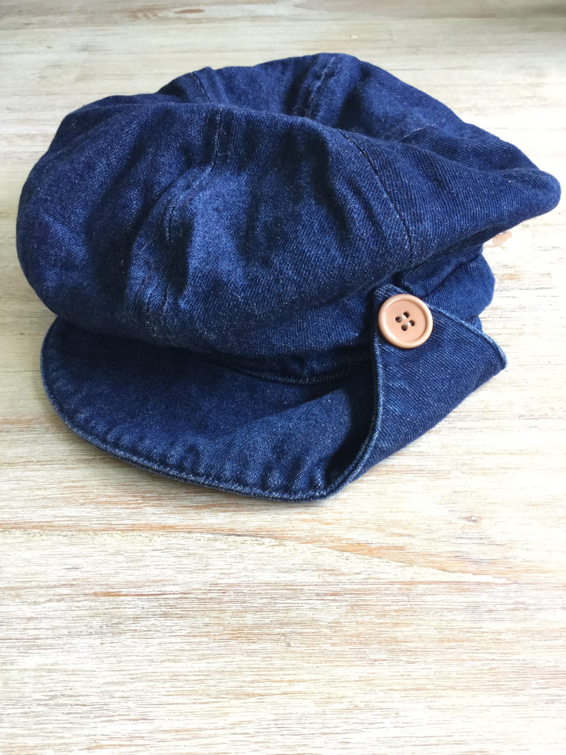 Dark denim ‘baker boy’ style cap with button detail on front. Generic brand, great condition, 56cm (around 8 years old).