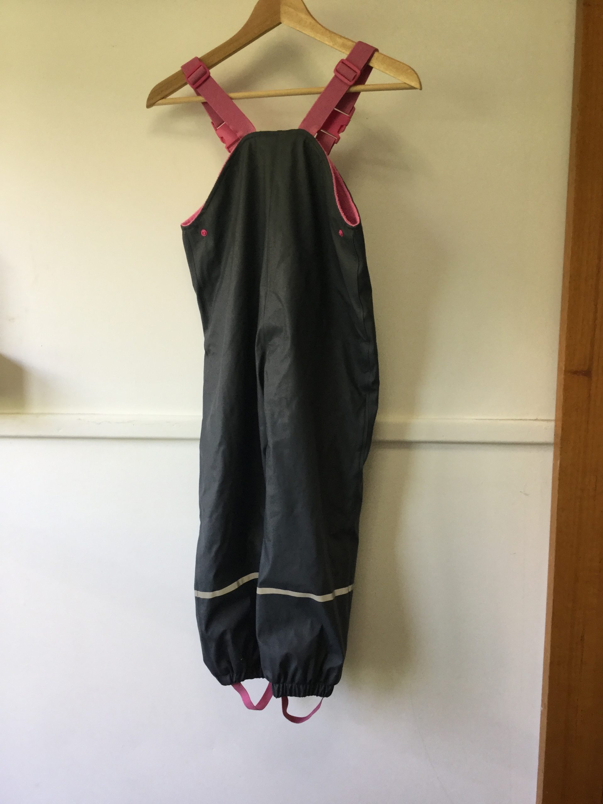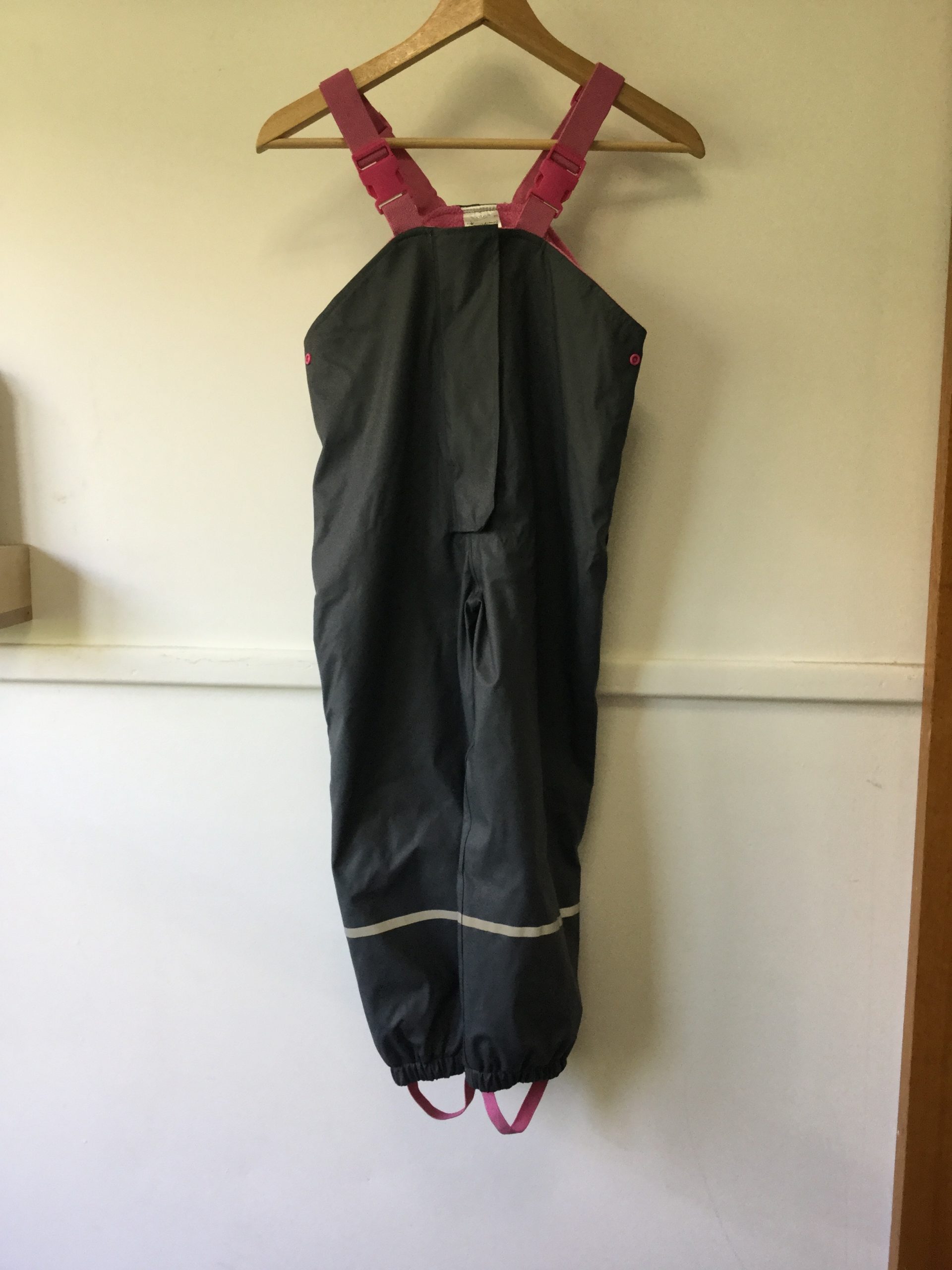 Impidimpi (German brand) fleece lined snow suit, size 7-8. Zip up and Velcro front as well as stirrups and adjustable shoulders. Excellent condition aside from a small tear near the bottom of the leg (see photo). Easy to clean wipe down fabric, waterproof and warm.