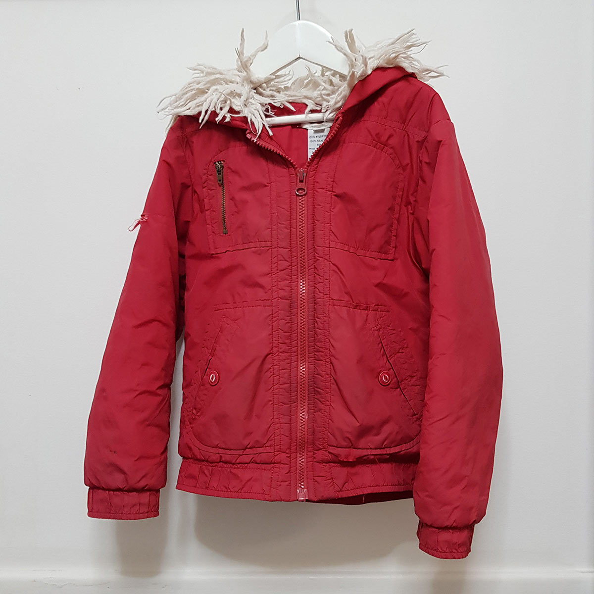 Red, Fred Bare Overcoat, Size 7. Minor repair needed (patch) on right upper sleeve. Faux-Fur lined hood. Well worn, some wear and tear.