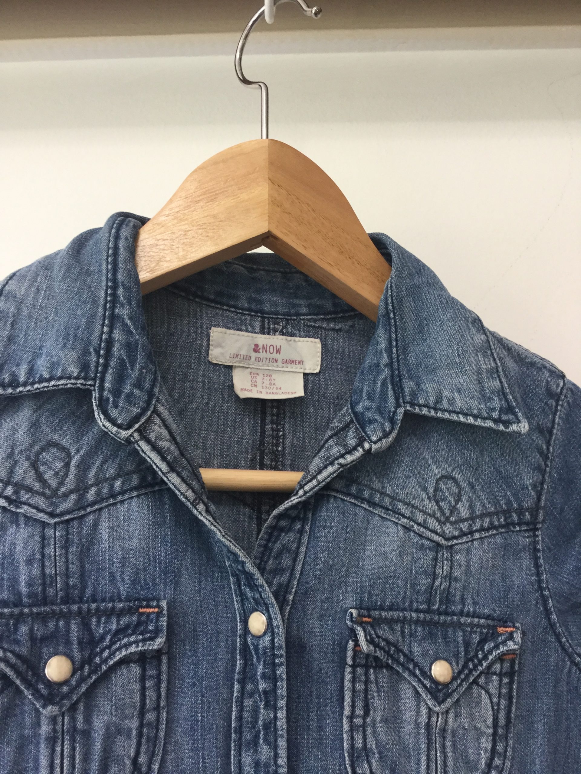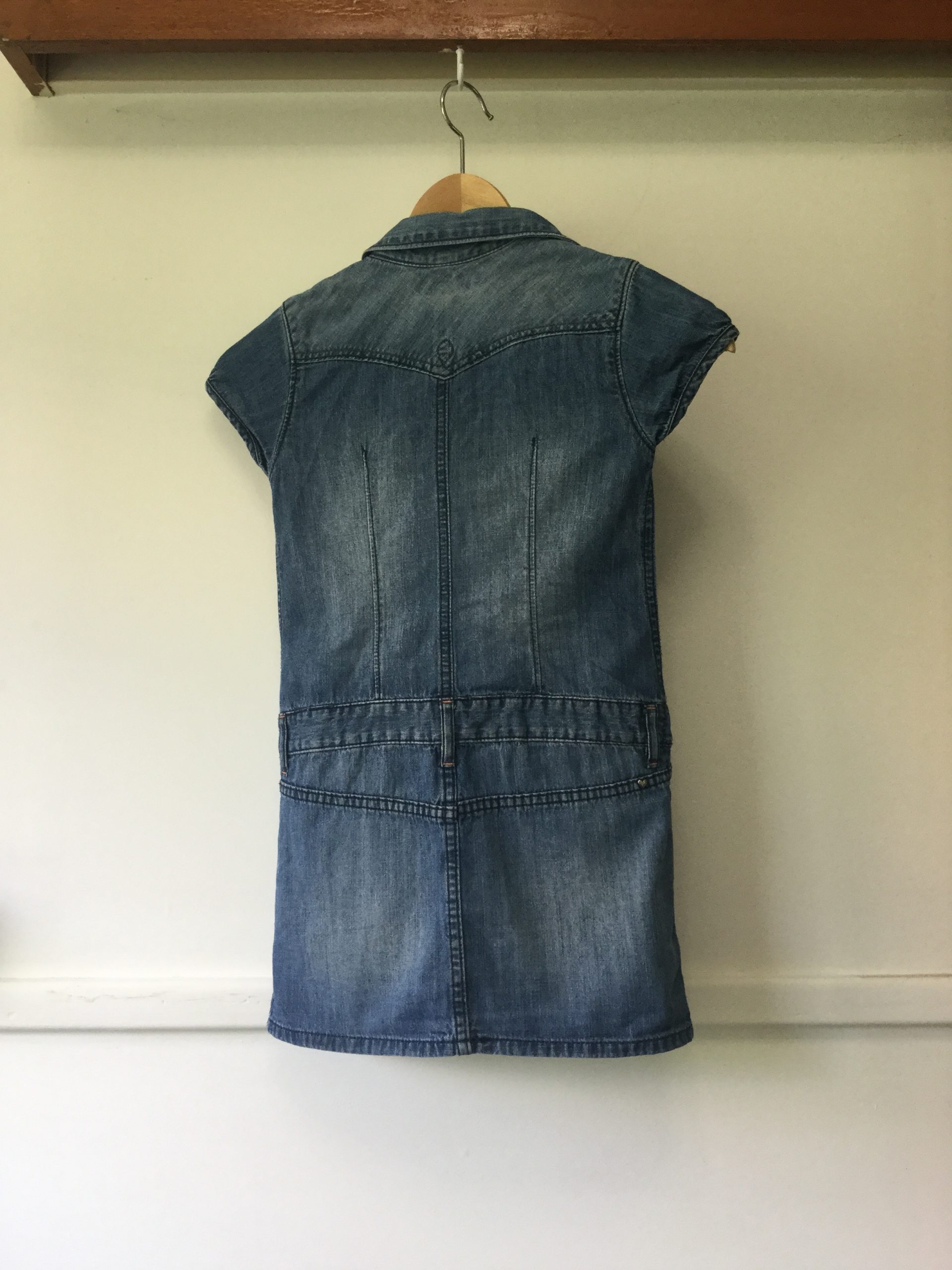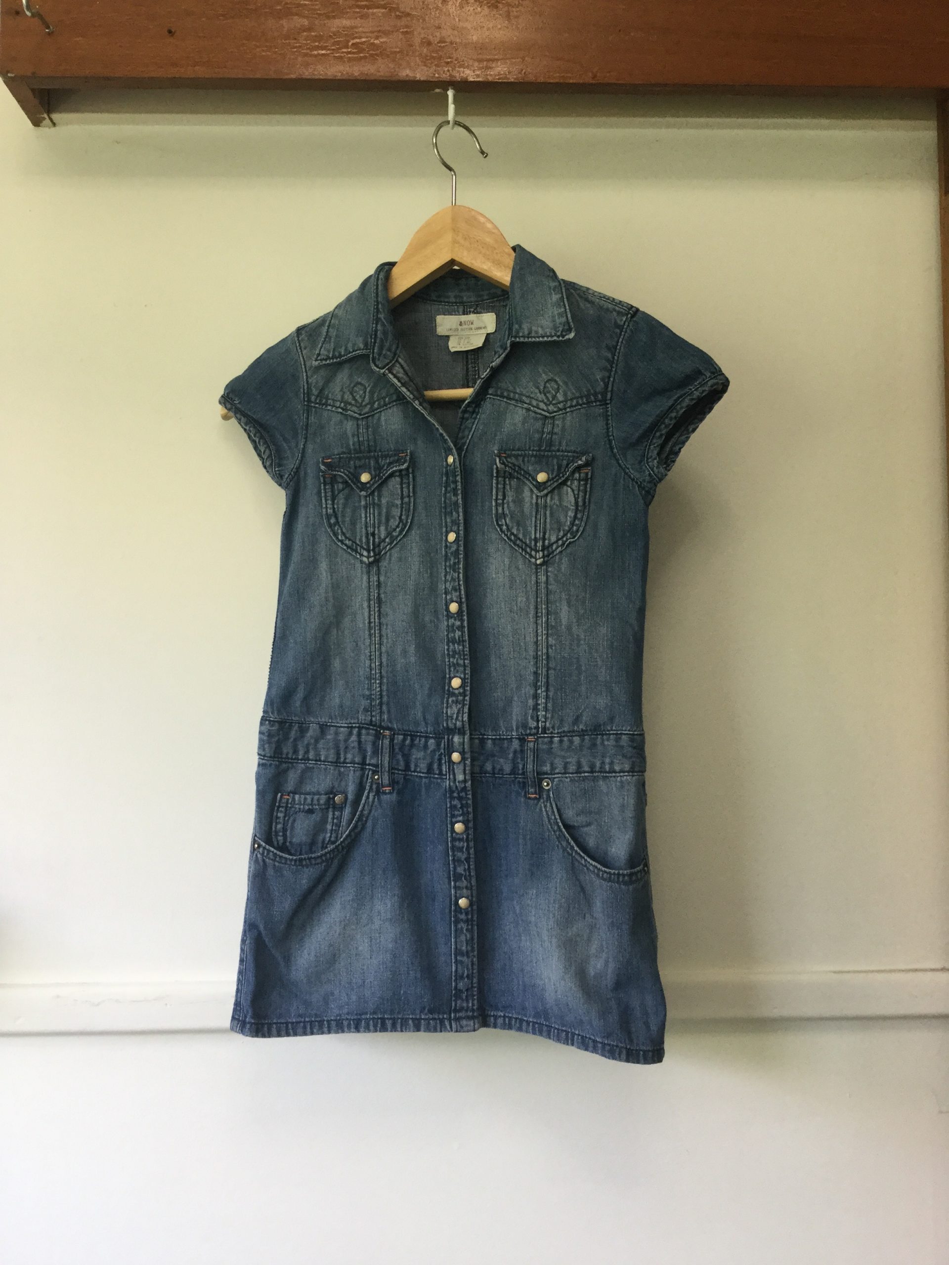 &Now brand (H&M) denim shirt dress. The fabric is a lightish softened 100% cotton blue denim and the ‘buttons’ are actually press studs. The dress is a size 7 and is in perfect condition.