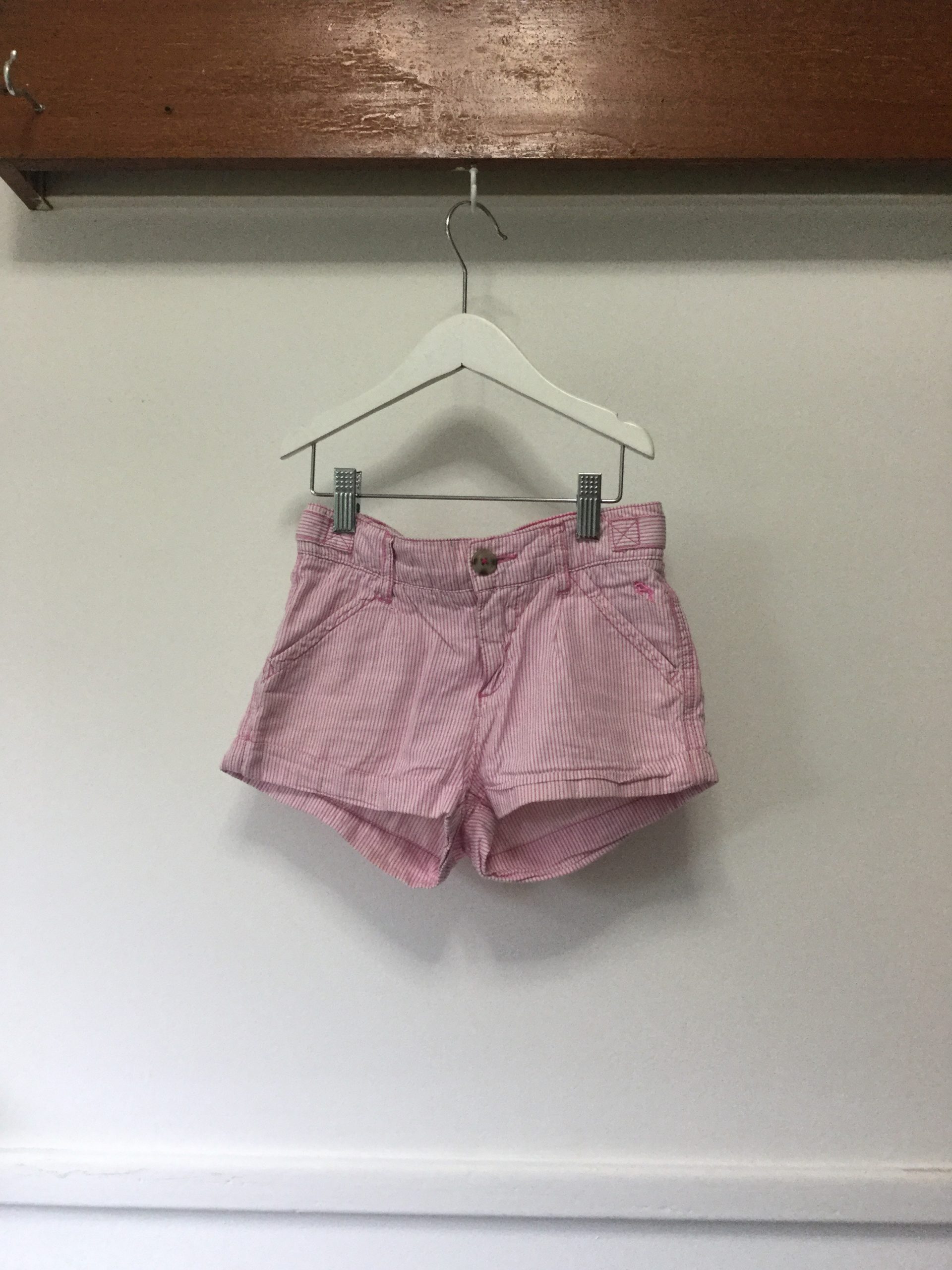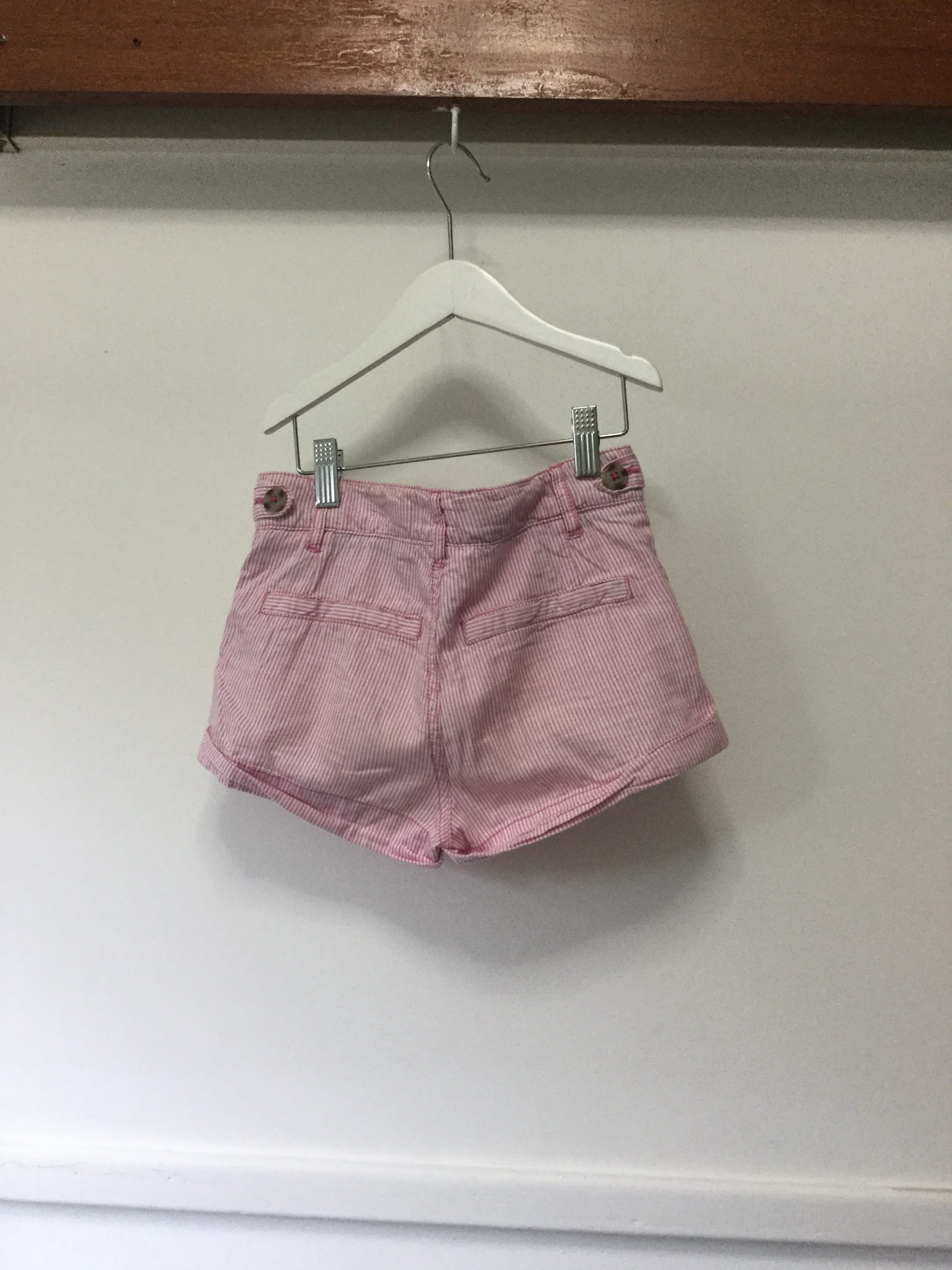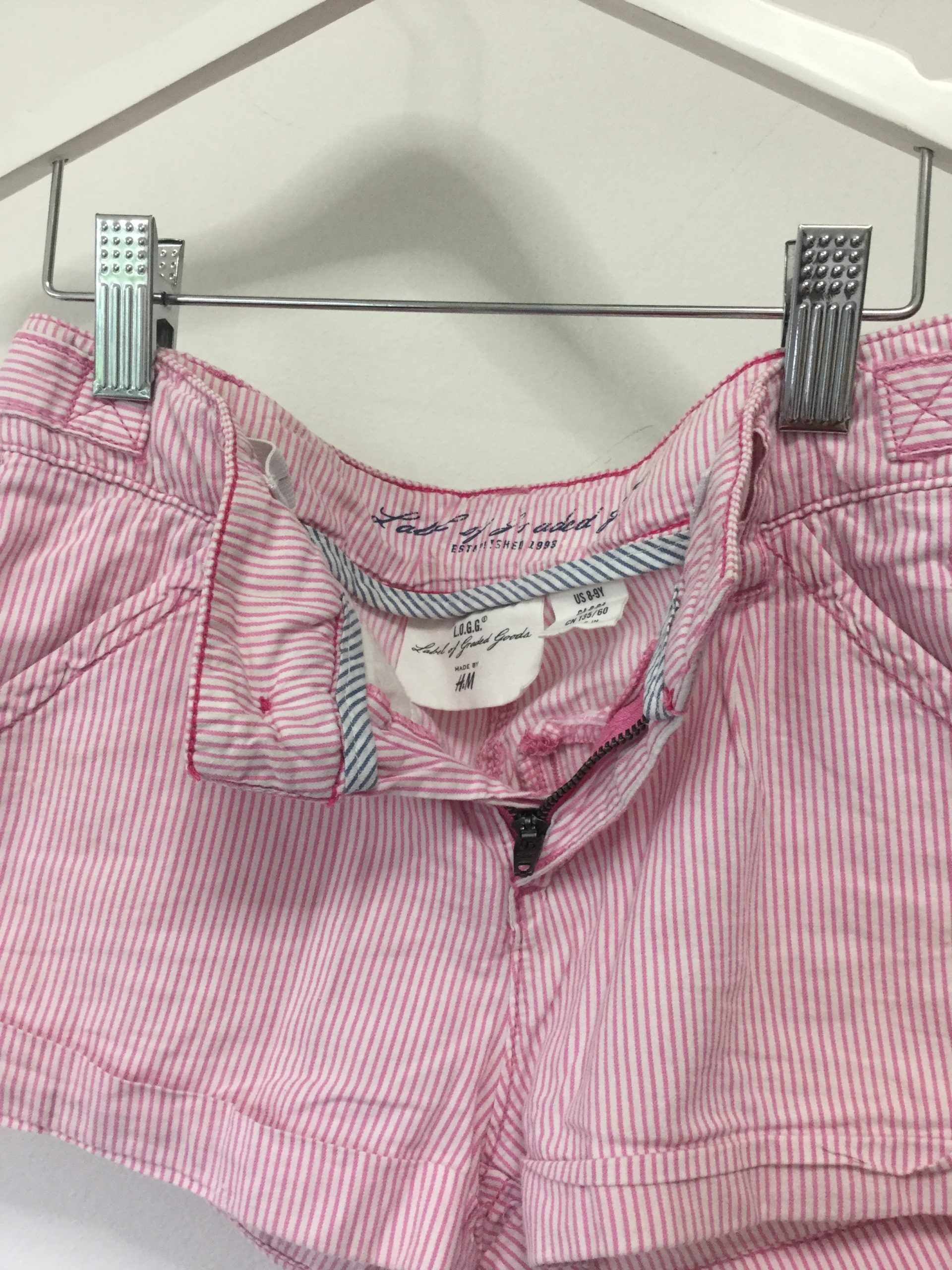 Pink and white stripe cotton H&M shorts, size 8-9. Good condition, very faint smudge on back but this is not noticeable. Zip and button fly with internal adjustable waist.