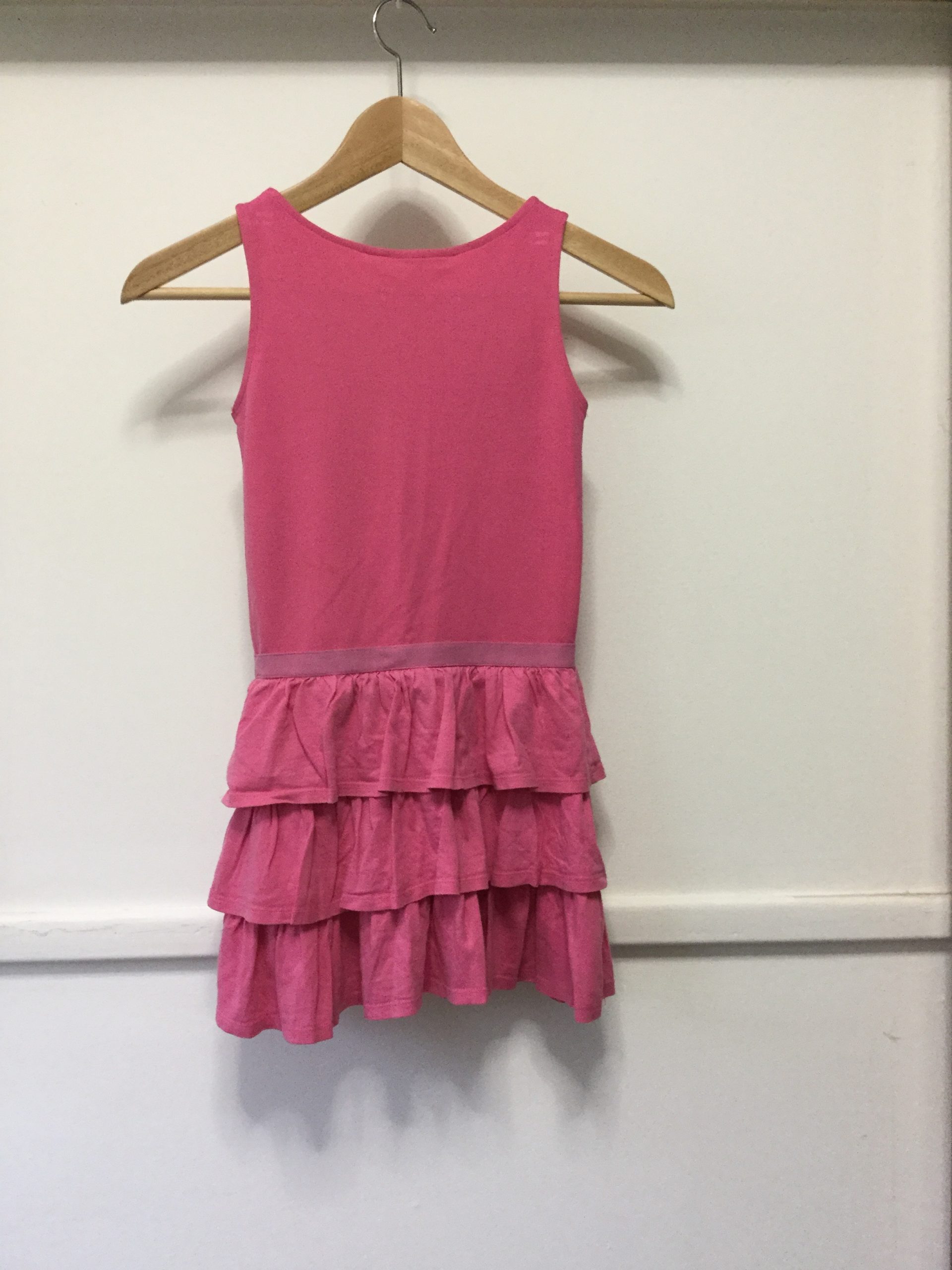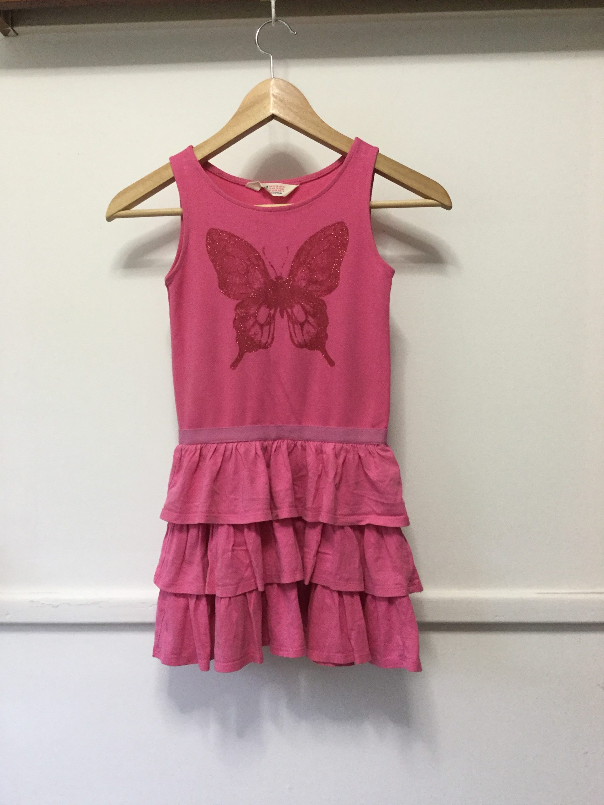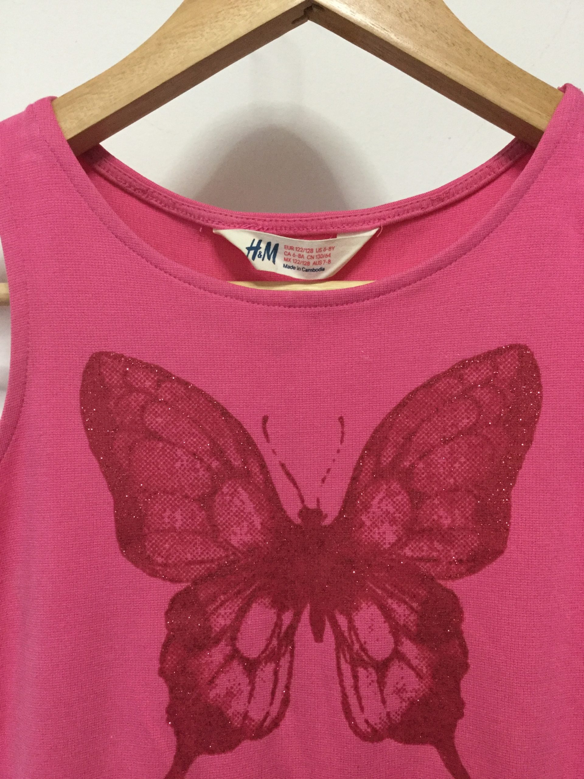 H&M pink dress with ruffle skirt and glittery butterfly motive, size 7-8. The top part is viscose and the skirt is cotton. Good condition.