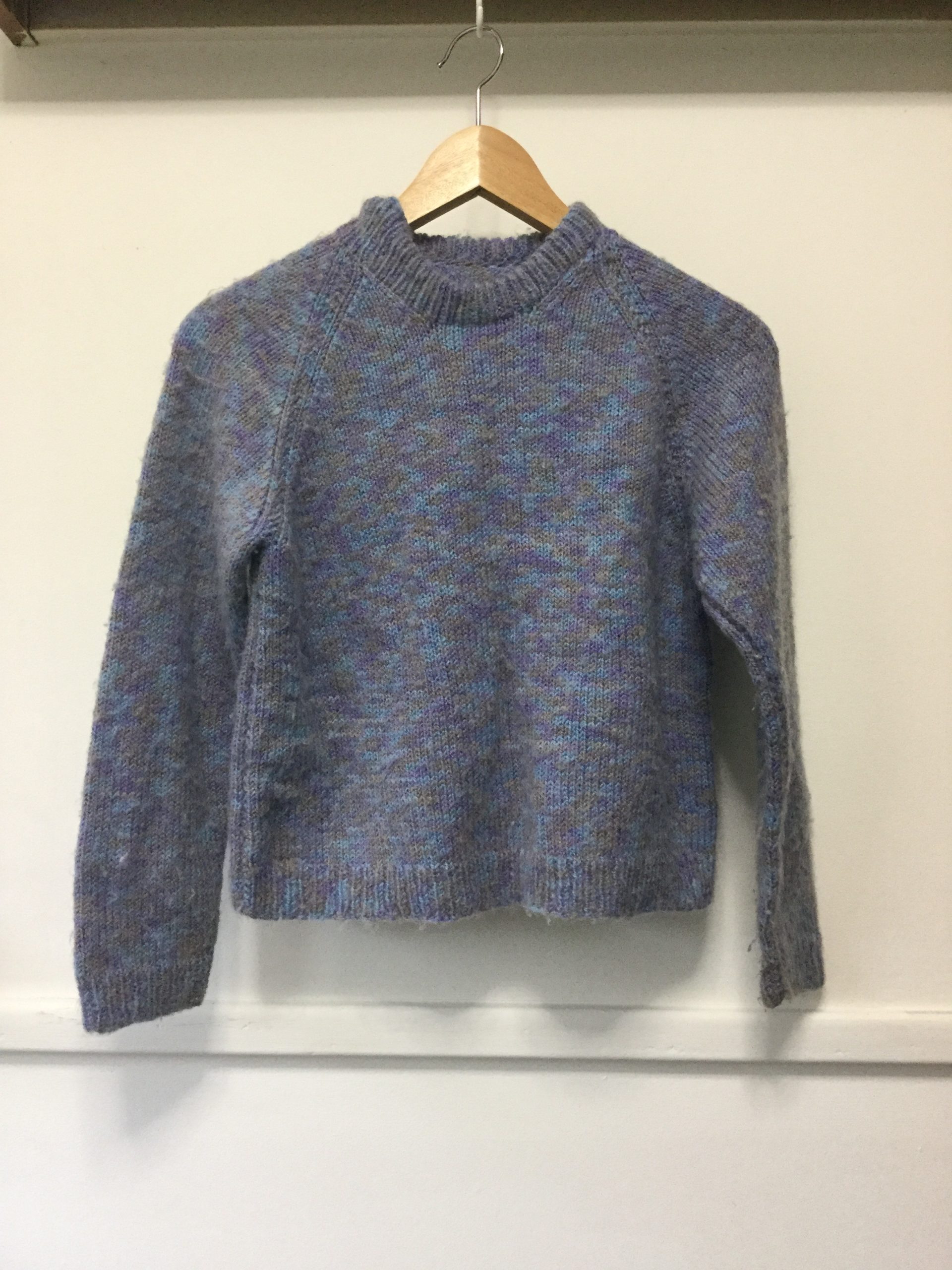 Hand knitted 100% wool jumper in a light blue/grey, purple colour. Excellent condition, size 8-10. Wool wash only.