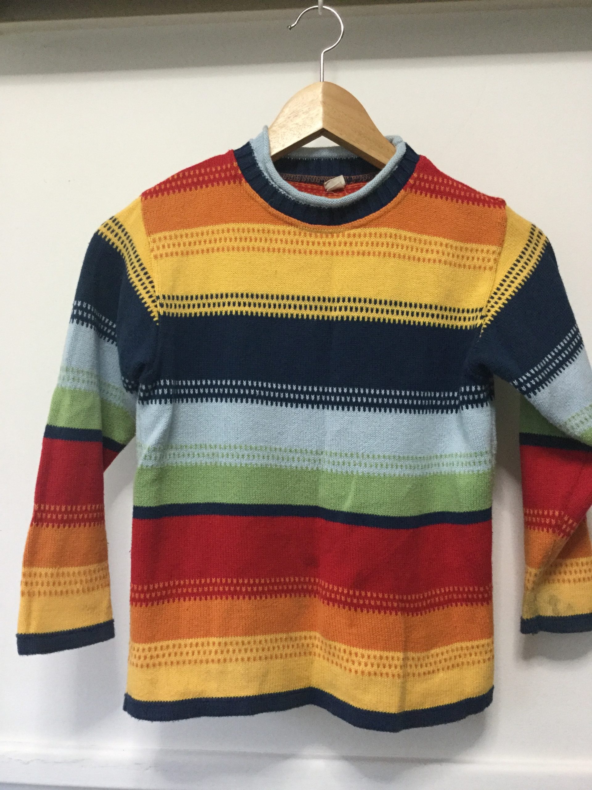 Multi coloured 100% cotton knitted lightweight jumper, size 7-8. This is a German brand ‘hessnatur’. The jumper is in good condition however there are some marks on the yellow parts of the sleeves and minor marks on the front (as shown in picture).