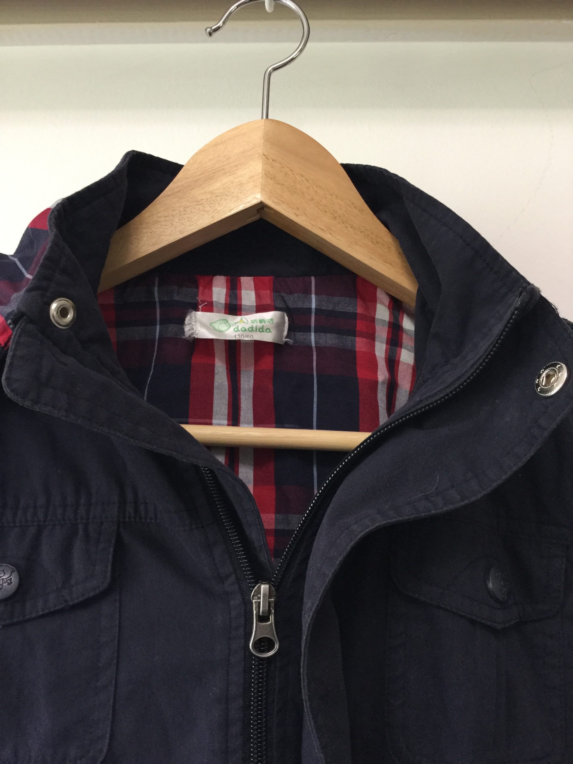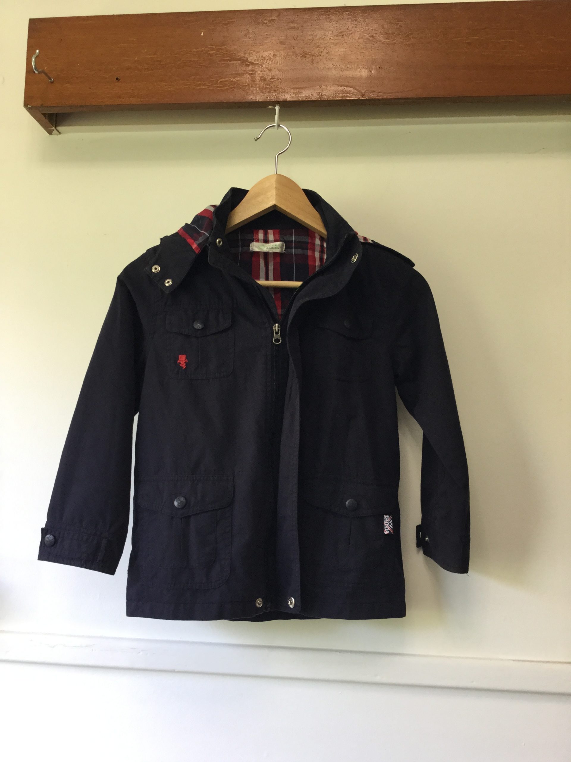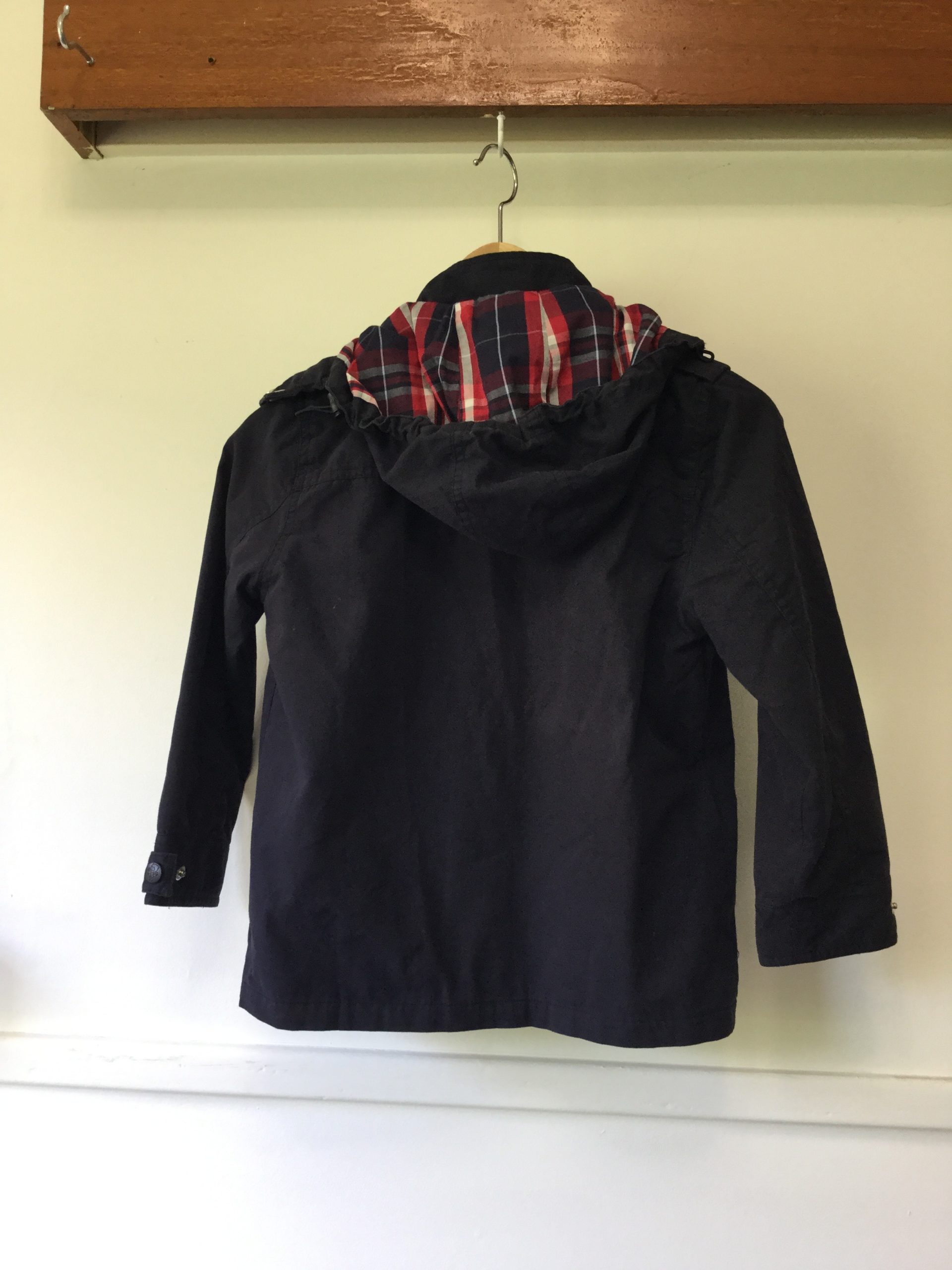 Navy blue coat with red check drawstring hood, zip up front, size 8-9. The material is double layered cotton and would be great over a jumper in winter and just a shirt at other times. Great looking coat in excellent condition.