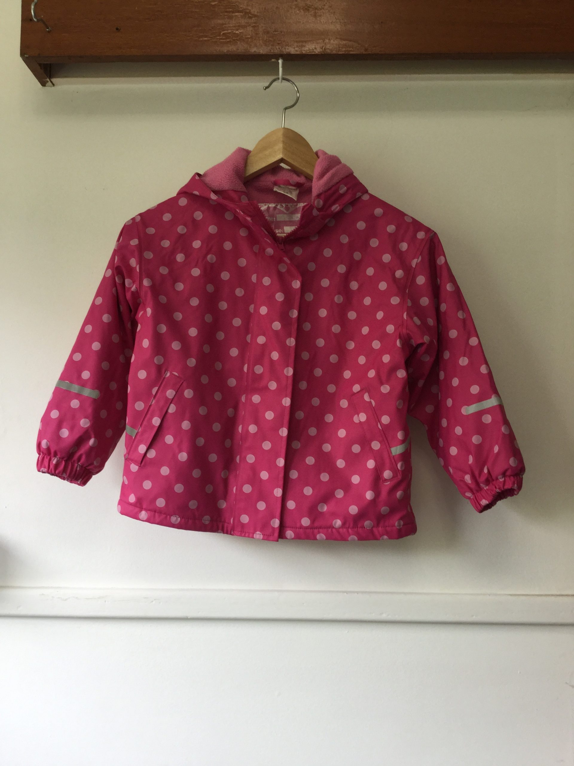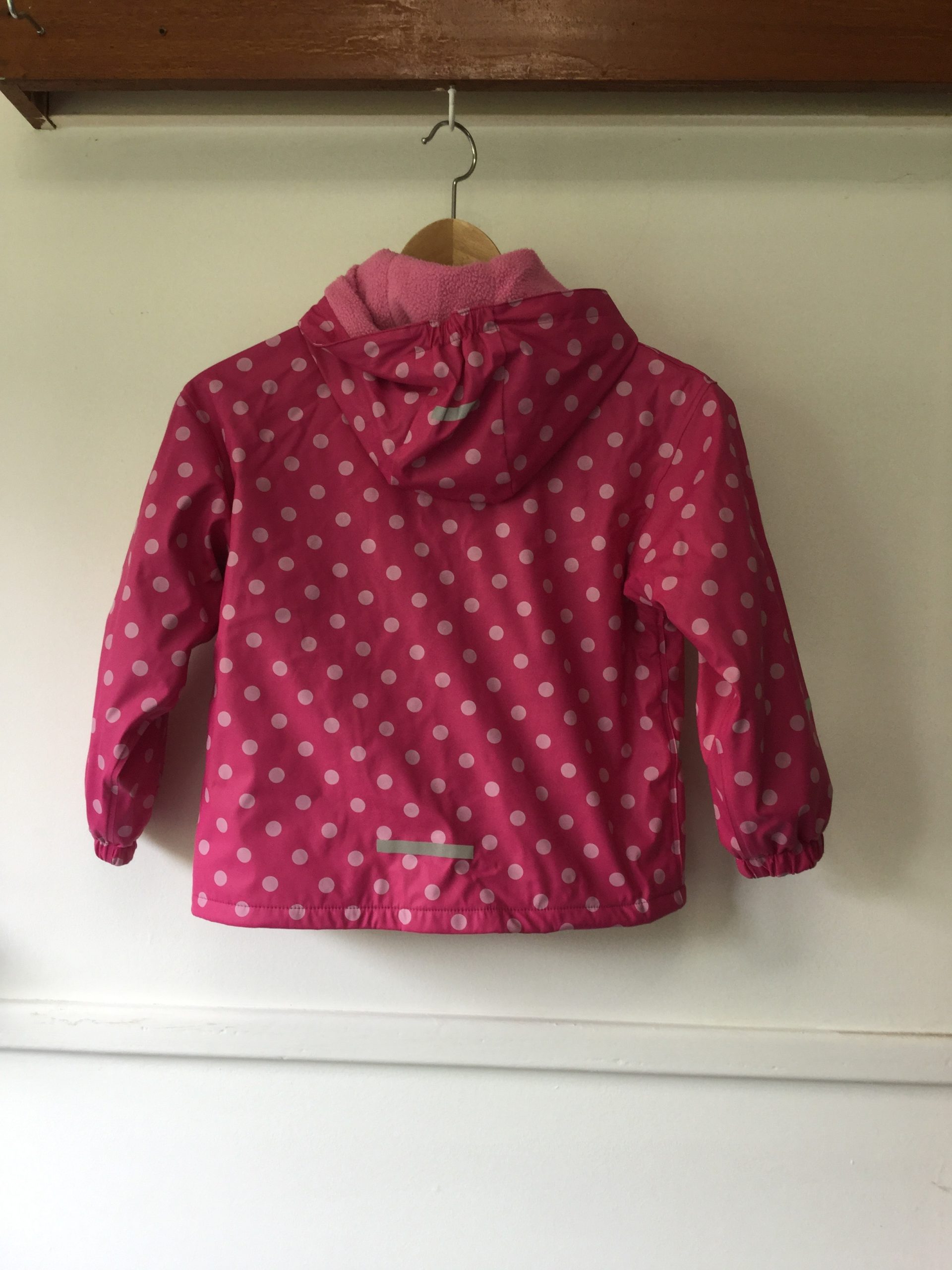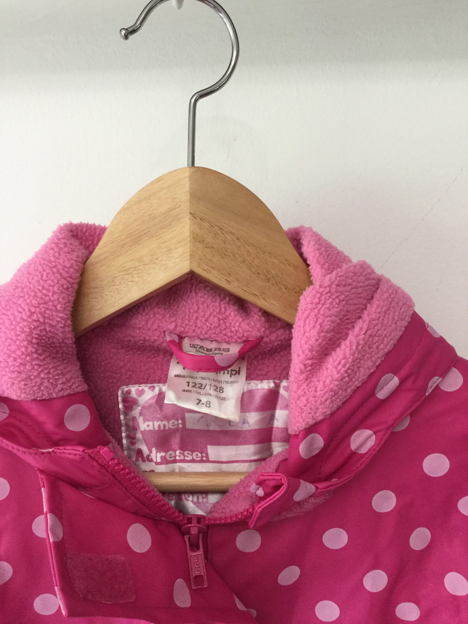 Impidimpi (German brand) pink, polka dot snow jacket, fleece lined and waterproof with hood, size 7-8. Excellent condition, zip up and Velcro front, great wipeable fabric, very warm. Matches with the grey impidimpi bottoms also for sale.