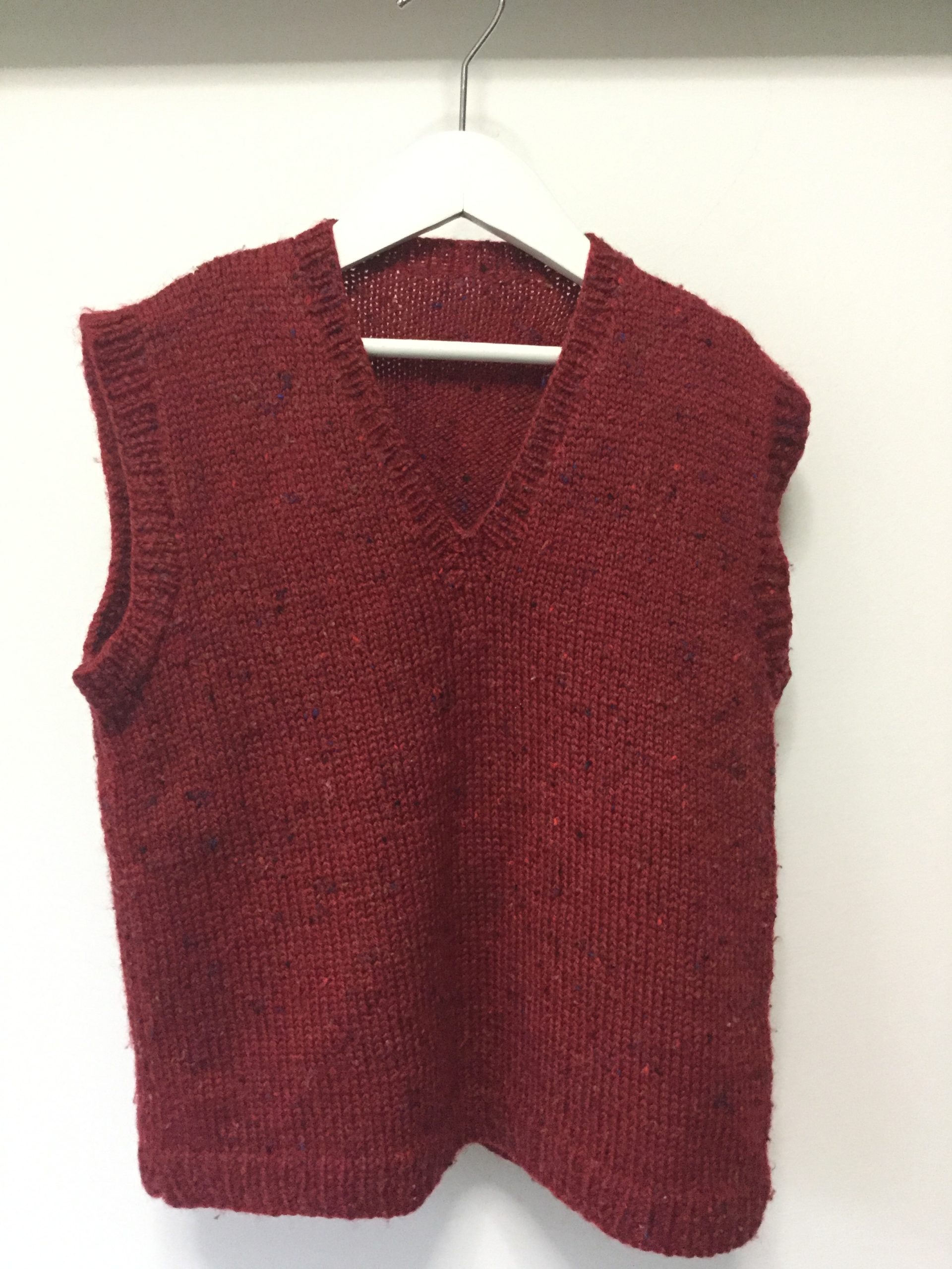 100% wool hand knitted vest, red with flecks of colour, size 6. Wool wash only.