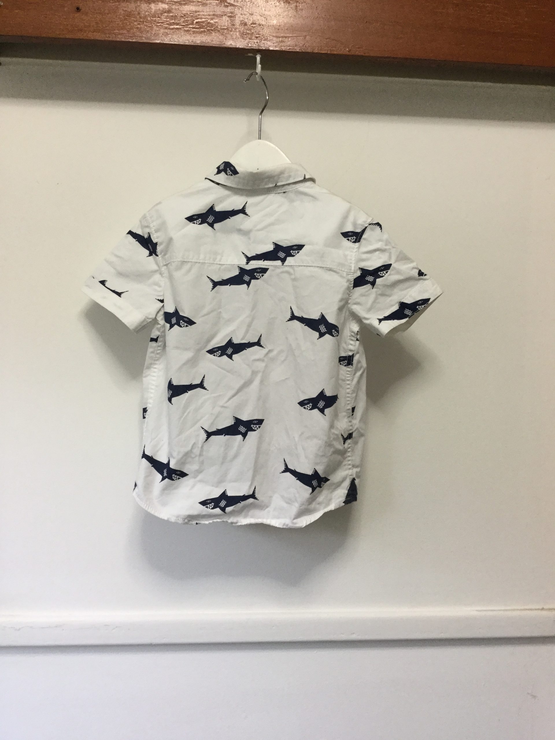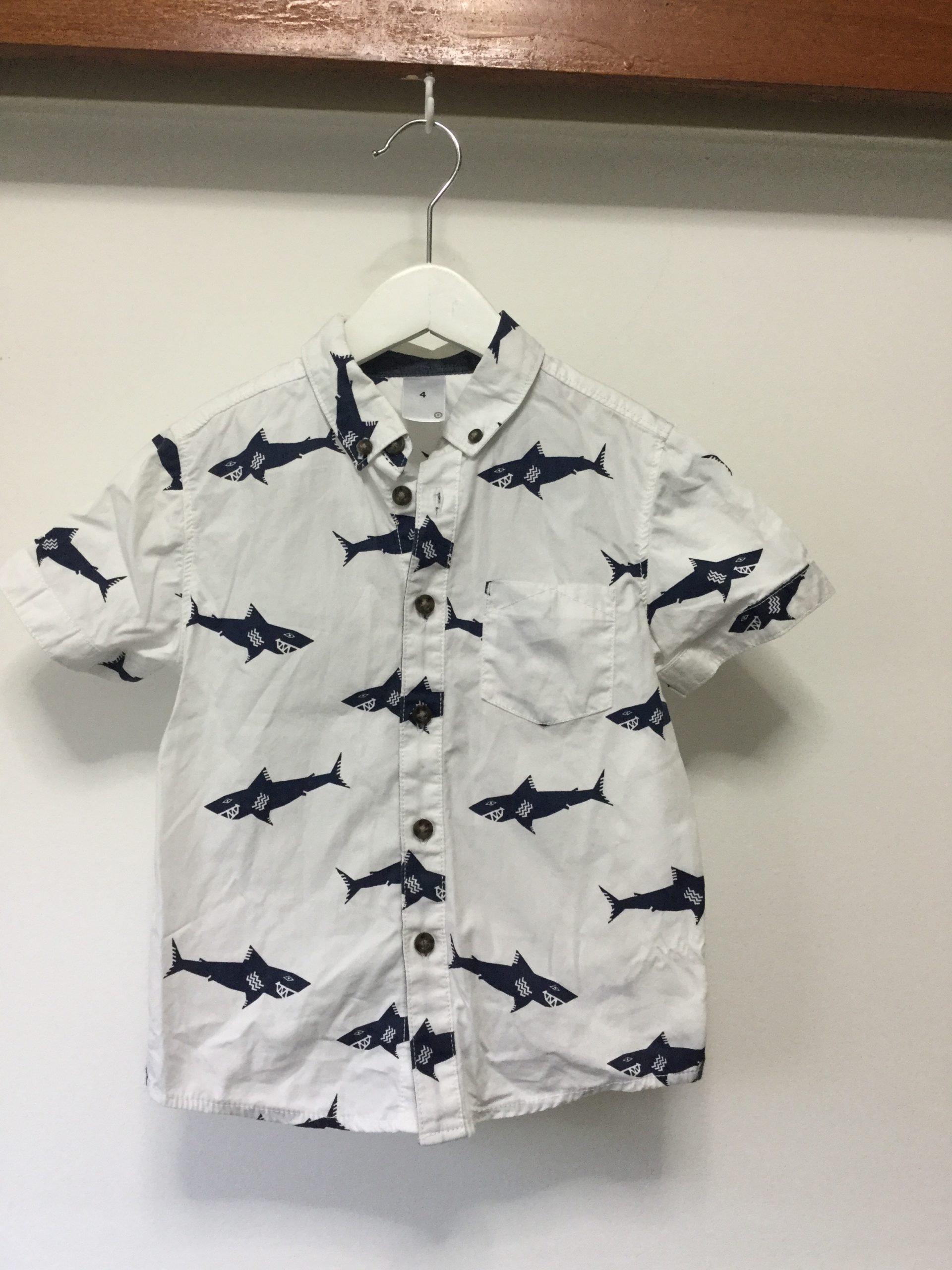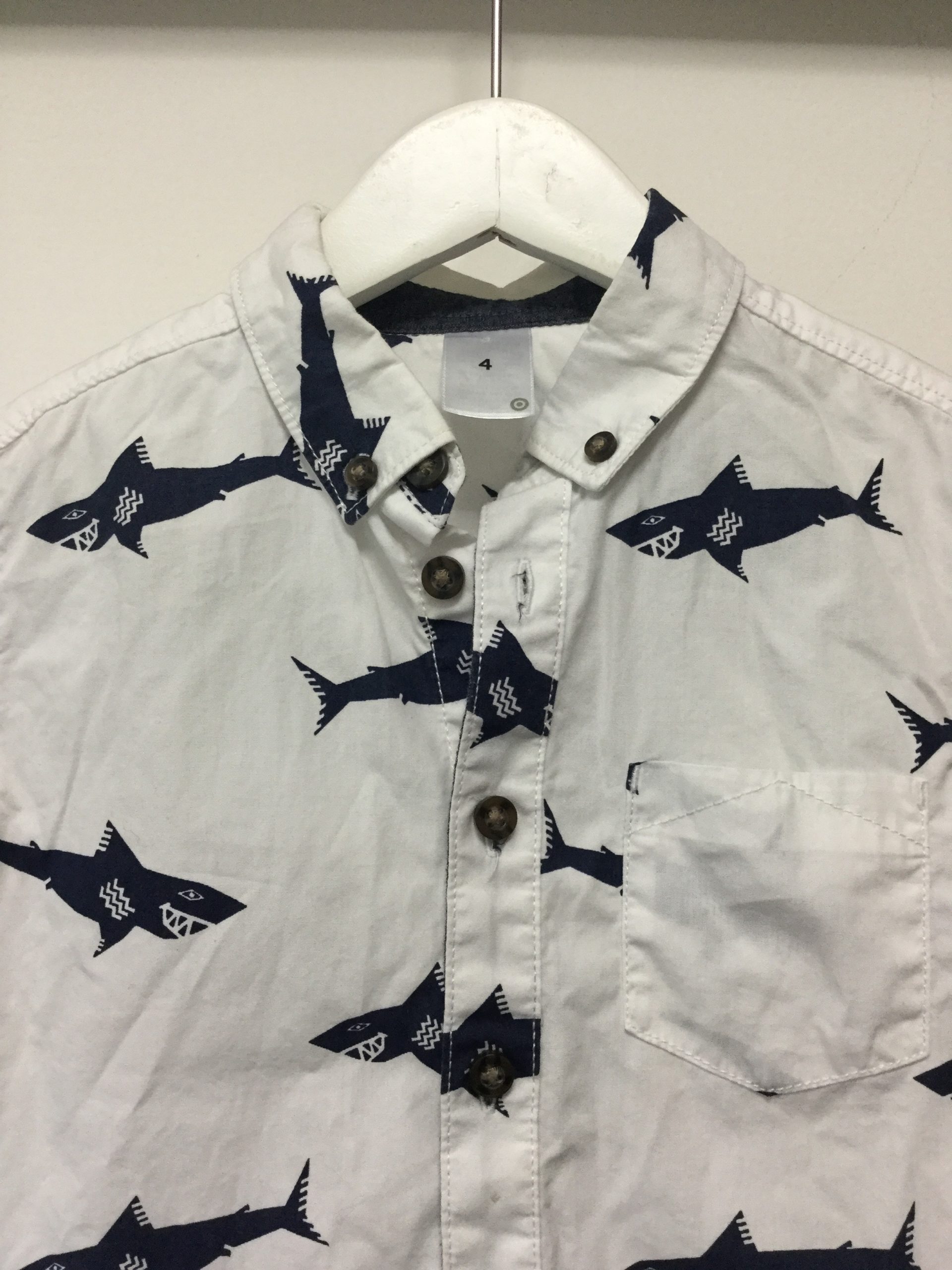 Navy blue/white button up cotton shirt with shark print, target, size 4. Good condition, faint mark near middle button.