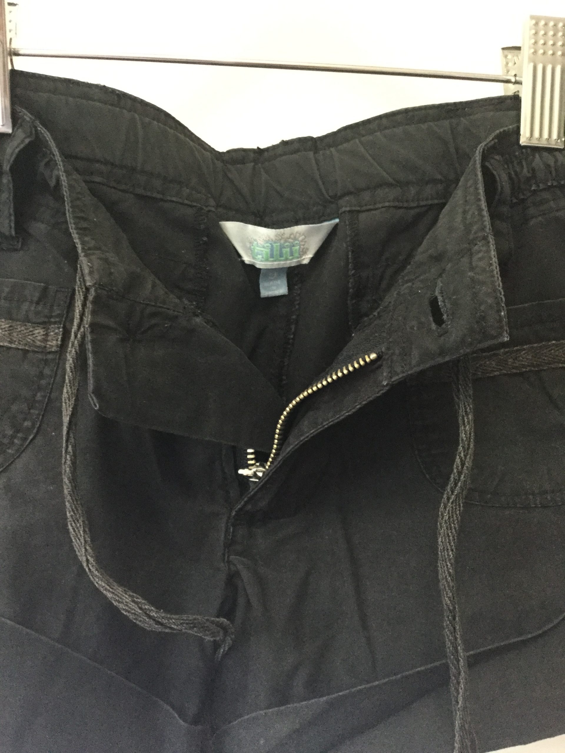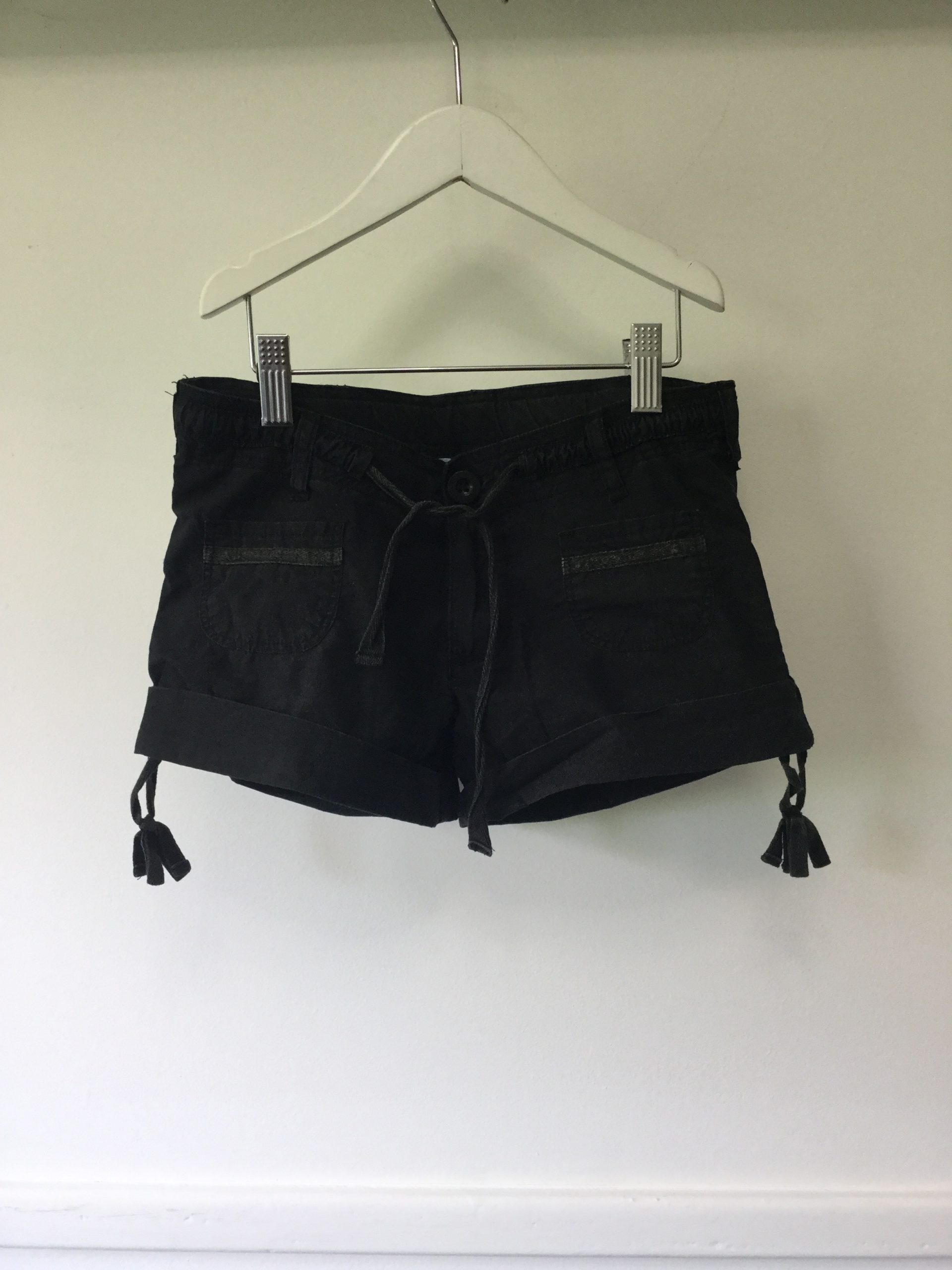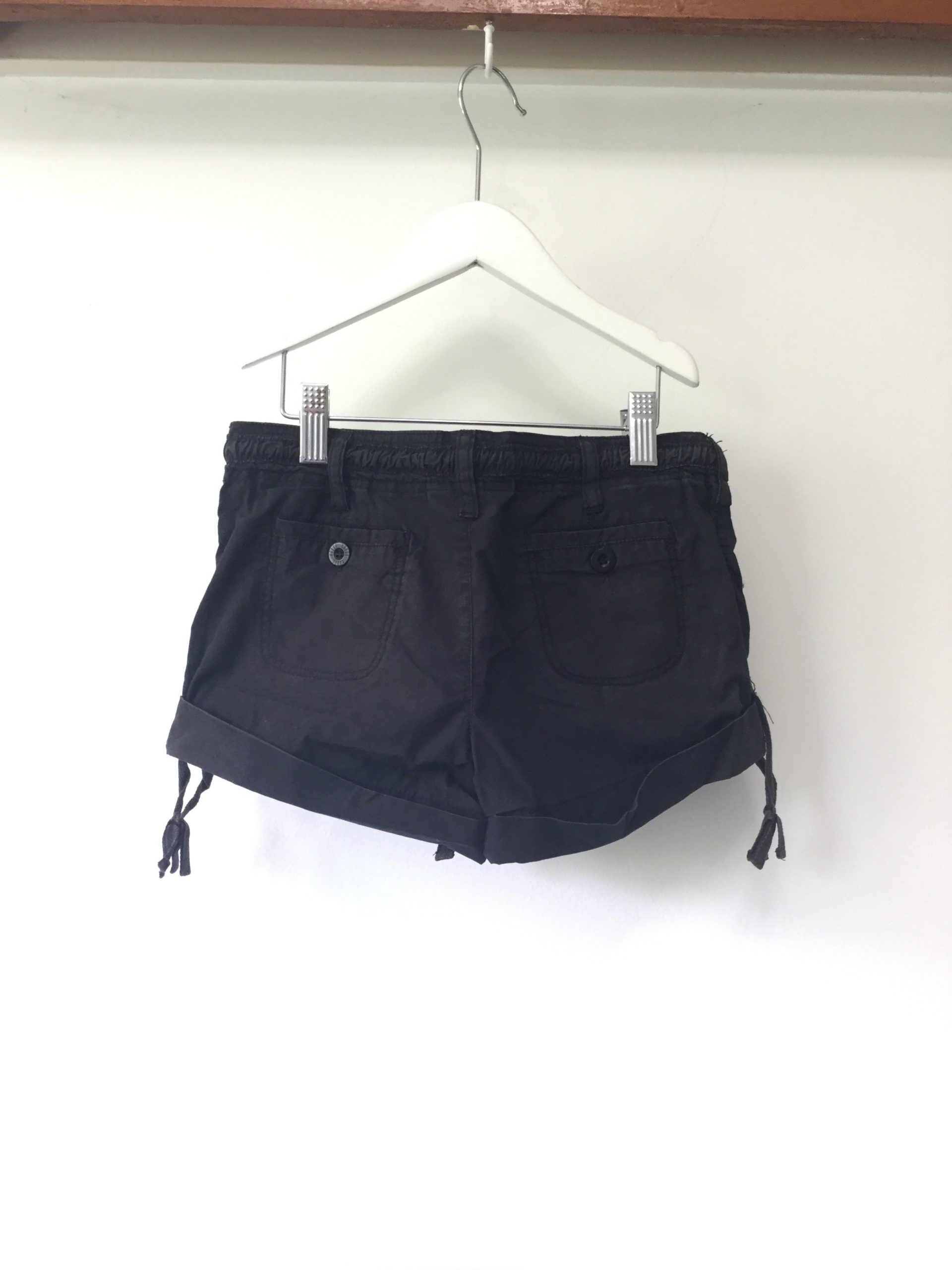 Tilii (Myer brand) shorts, size 9 in 100% cotton. The fabric is a slighly faded black with a zip, button and drawstring and decorative ties on the sides. Good condition.
